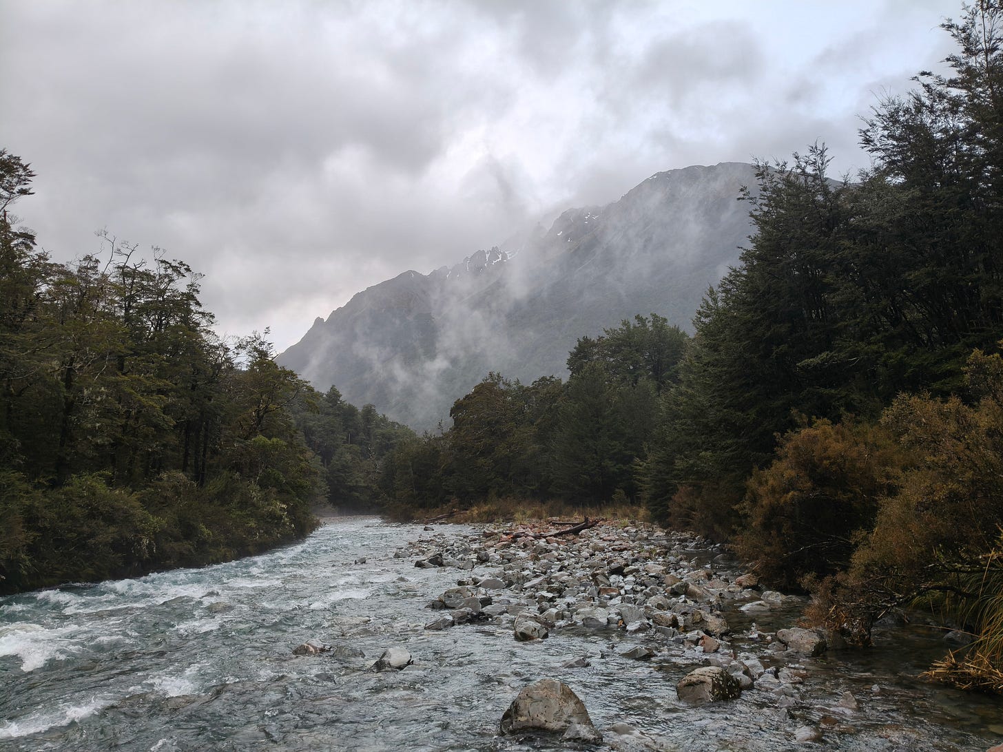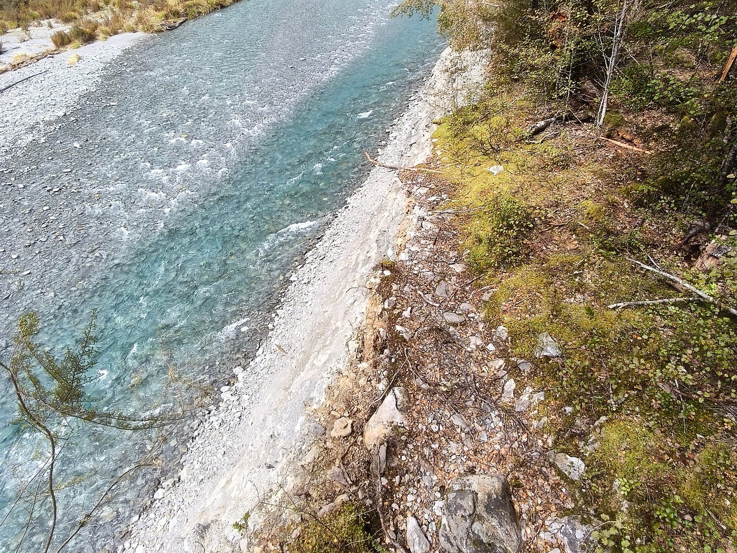 The first several kilometres from the hut were bliss: flat and over a well formed track. I should know, though, it never stays like that. I’d been warned by three separate parties about the fallen trees along this stretch of track. I received a fourth from a tramping party of six men, as I met them at the first of about three track washouts.